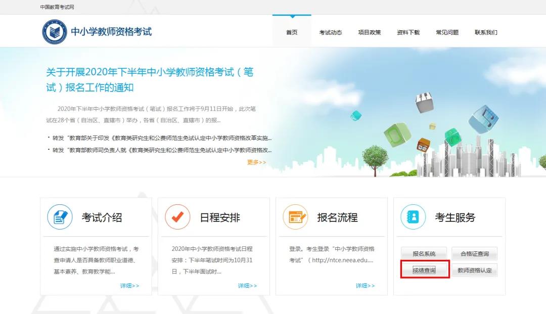 ②:進入網(wǎng)站后,在考生服務欄選擇成績查詢