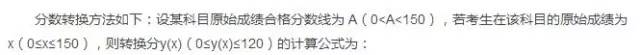 教育部考試中心根據(jù)考試標(biāo)準(zhǔn)和當(dāng)次考試情況,確定各科目全國統(tǒng)一的合格分?jǐn)?shù)線。由于各個科目難度存在差異,其合格分?jǐn)?shù)線不盡相同。為統(tǒng)一各科目的合格分?jǐn)?shù)線,采用線性轉(zhuǎn)換的方法,將考生0~150分量表上的原始成績換算為0~120分量表上的轉(zhuǎn)換分,并使各科目的合格分?jǐn)?shù)線統(tǒng)一轉(zhuǎn)換為70分。
