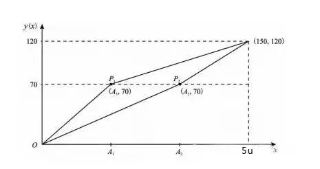 舉例來說,設(shè)兩個科目的合格分?jǐn)?shù)線分別為 A1和 A2,則轉(zhuǎn)換分 y(x) 關(guān)于原始成績x的函數(shù)圖像,如下圖所示: