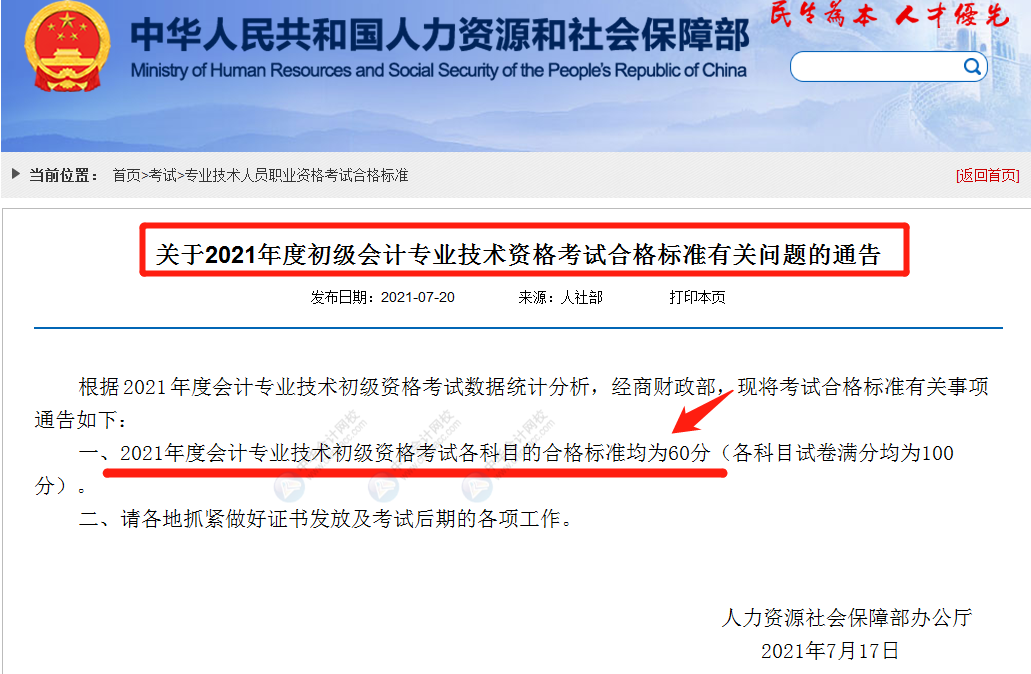 人社部正式公布:2021年度會計專業(yè)技術(shù)初級資格考試各科目的合格標(biāo)準(zhǔn)均為60分(各科目試卷滿分均為100分)。