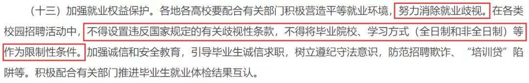 原文:加強(qiáng)就業(yè)權(quán)益保護(hù)。各地各高校要配合有關(guān)部門積極營(yíng)造平等就業(yè)環(huán)境,努力消除就業(yè)歧視。在各類校園招聘活動(dòng)中,不得設(shè)置違反國(guó)家規(guī)定的有關(guān)歧視性條款,不得將畢業(yè)院校、學(xué)習(xí)方式(全日制和非全日制)等作為限制性條件。加強(qiáng)誠(chéng)信和安全教育,引導(dǎo)畢業(yè)生誠(chéng)信求職,樹(shù)立遵紀(jì)守法意識(shí),防范招聘欺詐、“培訓(xùn)貸”陷阱等。積極配合有關(guān)部門推進(jìn)畢業(yè)生就業(yè)體檢結(jié)果互認(rèn)。