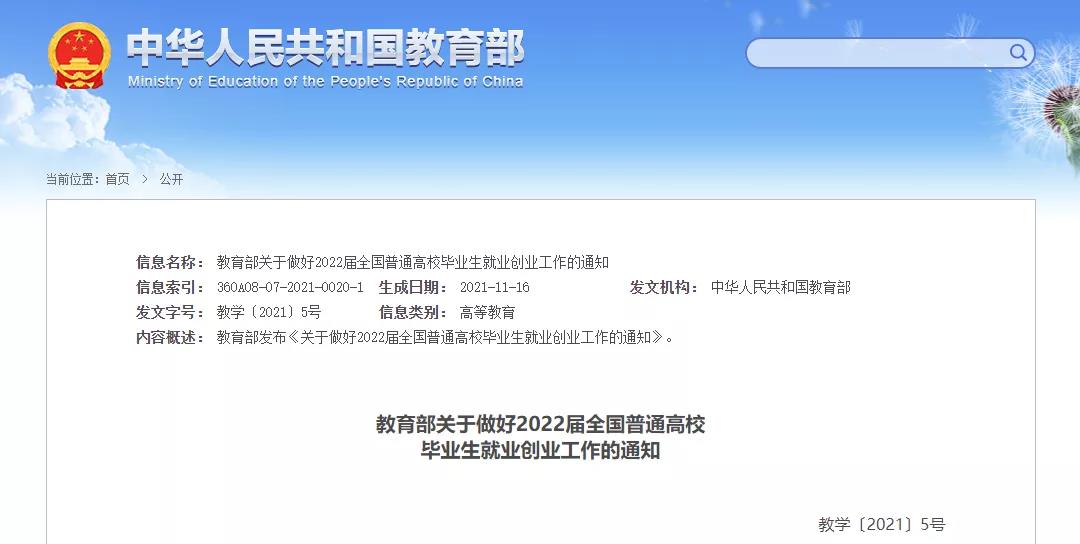 近日,教育部官網(wǎng)發(fā)布《教育部關(guān)于做好2022屆全國(guó)普通高校畢業(yè)生就業(yè)創(chuàng)業(yè)工作的通知》。