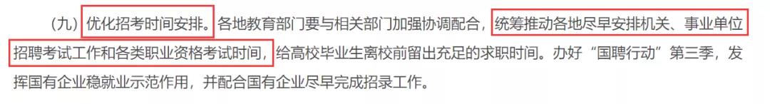 原文:優(yōu)化招考時(shí)間安排。各地教育部門要與相關(guān)部門加強(qiáng)協(xié)調(diào)配合,統(tǒng)籌推動(dòng)各地盡早安排機(jī)關(guān)、事業(yè)單位招聘考試工作和各類職業(yè)資格考試時(shí)間,給高校畢業(yè)生離校前留出充足的求職時(shí)間。辦好“國(guó)聘行動(dòng)”第三季,發(fā)揮國(guó)有企業(yè)穩(wěn)就業(yè)示范作用,并配合國(guó)有企業(yè)盡早完成招錄工作。