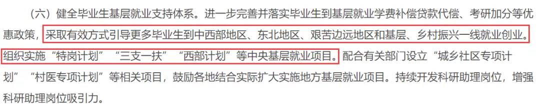 原文:健全畢業(yè)生基層就業(yè)支持體系。進(jìn)一步完善并落實(shí)畢業(yè)生到基層就業(yè)學(xué)費(fèi)補(bǔ)償貸款代償、考研加分等優(yōu)惠政策,采取有效方式引導(dǎo)更多畢業(yè)生到中西部地區(qū)、東北地區(qū)、艱苦邊遠(yuǎn)地區(qū)和基層、鄉(xiāng)村振興一線就業(yè)創(chuàng)業(yè)。
