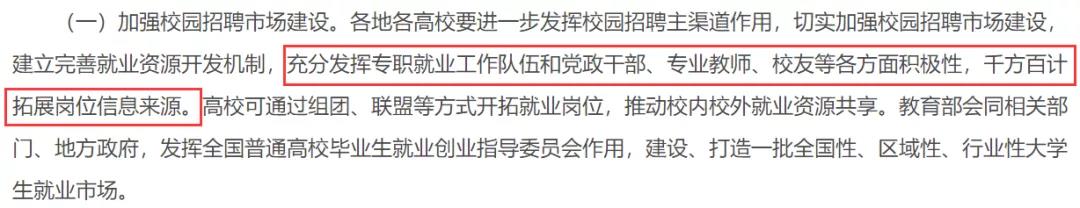 原文:各地各高校要進(jìn)一步發(fā)揮校園招聘主渠道作用,切實(shí)加強(qiáng)校園招聘市場(chǎng)建設(shè),建立完善就業(yè)資源開(kāi)發(fā)機(jī)制,千方百計(jì)拓展崗位信息來(lái)源。高??赏ㄟ^(guò)組團(tuán)、聯(lián)盟等方式開(kāi)拓就業(yè)崗位,推動(dòng)校內(nèi)校外就業(yè)資源共享。