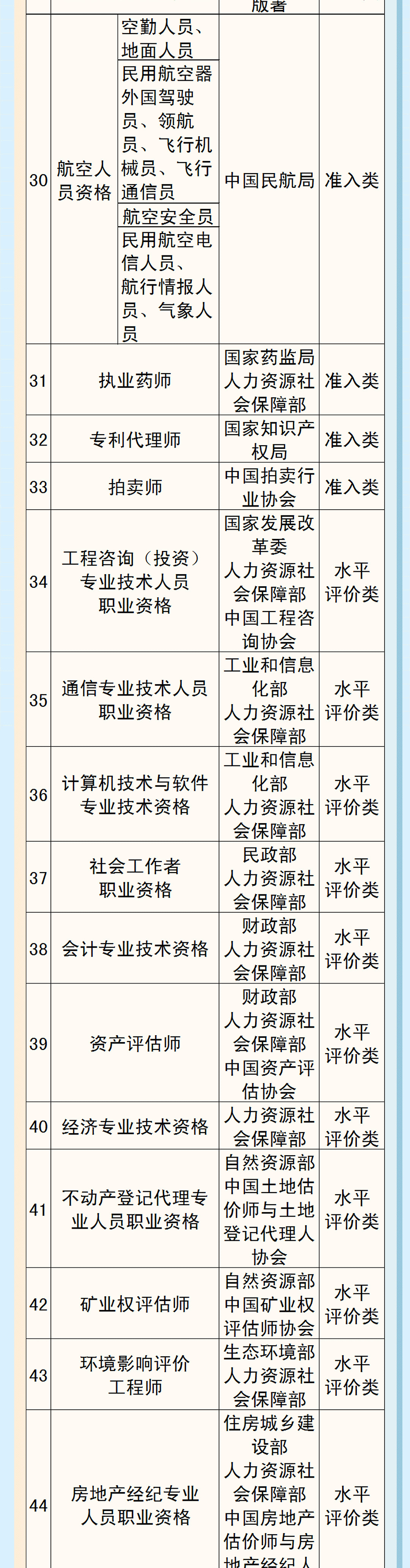 在專業(yè)技術(shù)人員職業(yè)資格方面,新增“精算師”“礦業(yè)權(quán)評(píng)估師”水平評(píng)價(jià)類職業(yè)資格,在醫(yī)生資格下設(shè)置“職業(yè)病診斷醫(yī)師”子項(xiàng)。新增職業(yè)資格項(xiàng)目均具有較強(qiáng)的專業(yè)性和社會(huì)通用性,技術(shù)技能要求較高,行業(yè)管理和人才隊(duì)伍建設(shè)確實(shí)需要。
