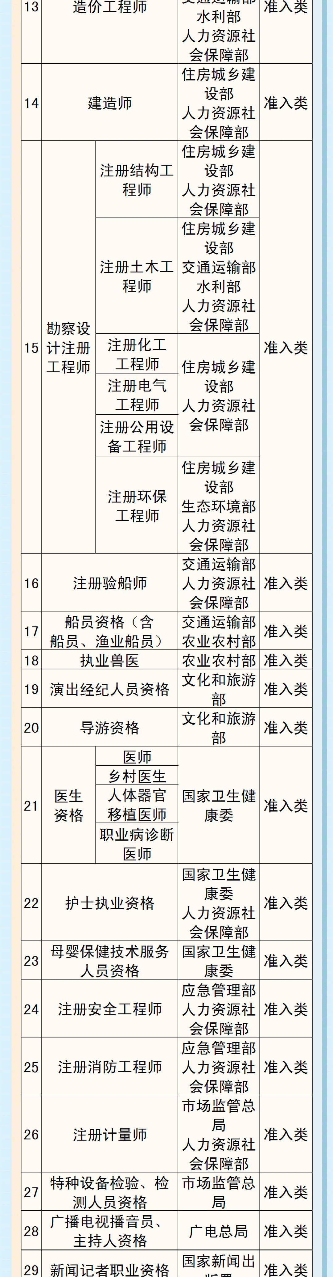 在專業(yè)技術(shù)人員職業(yè)資格方面,“出入境檢疫處理人員資格”、“鄉(xiāng)村獸醫(yī)資格”和勘察設(shè)計(jì)注冊(cè)工程師下的“注冊(cè)石油天然氣工程師”“注冊(cè)冶金工程師”“注冊(cè)采礦/礦物工程師”“注冊(cè)機(jī)械工程師”退出目錄,從業(yè)人員依據(jù)行業(yè)標(biāo)準(zhǔn)開展技術(shù)活動(dòng)。