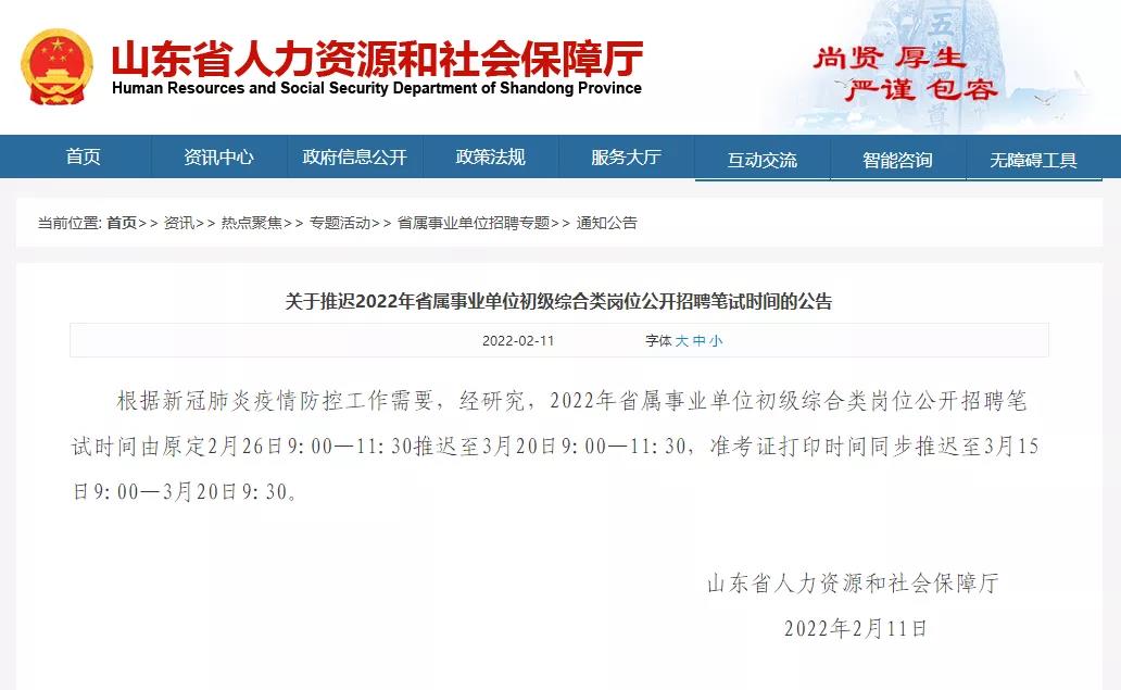 山東2022省屬事業(yè)單位初級綜合類崗位公開招聘筆試推遲!