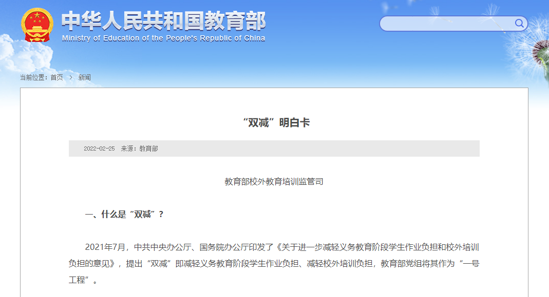 2021年7月,中共中央辦公廳、國(guó)務(wù)院辦公廳印發(fā)了《關(guān)于進(jìn)一步減輕義務(wù)教育階段學(xué)生作業(yè)負(fù)擔(dān)和校外培訓(xùn)負(fù)擔(dān)的意見(jiàn)》,提出“雙減”即減輕義務(wù)教育階段學(xué)生作業(yè)負(fù)擔(dān)、減輕校外培訓(xùn)負(fù)擔(dān),教育部黨組將其作為“一號(hào)工程”。
