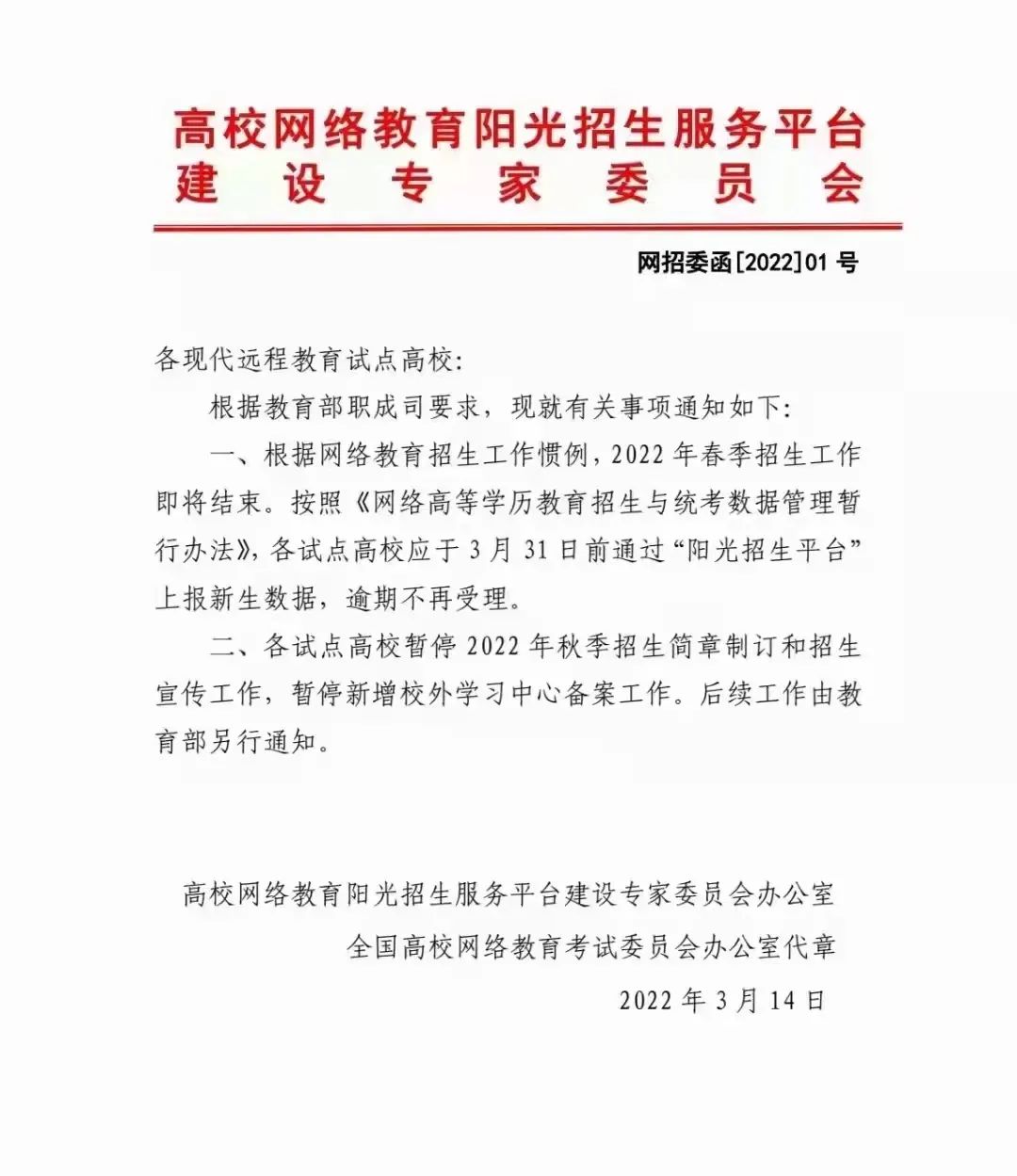 高校網(wǎng)絡(luò)教育陽(yáng)光招生服務(wù)平臺(tái)建設(shè)專(zhuān)家委員會(huì)發(fā)布通知,暫停網(wǎng)絡(luò)教育招生及宣傳工作,后續(xù)工作由教育部另行通知