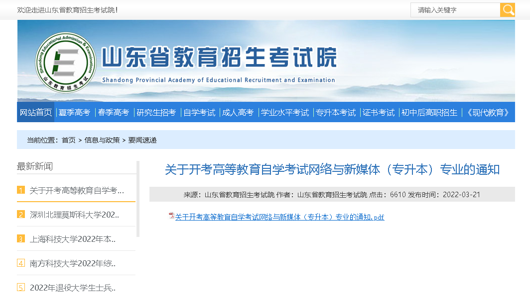 山東省高等教育自學(xué)考試委員會(huì)關(guān)于開考高等教育自學(xué)考試網(wǎng)絡(luò)與新媒體(專升本)專業(yè)的通知