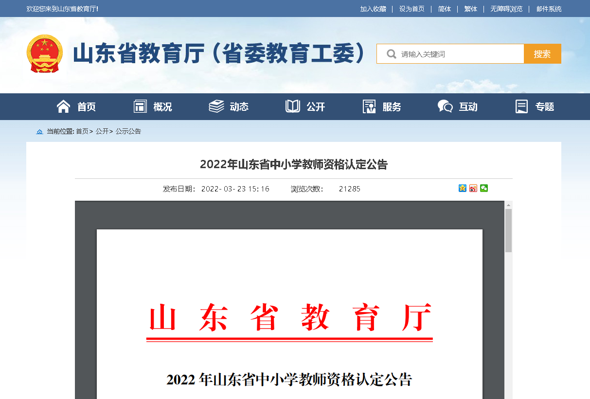 日前,省教育廳發(fā)布《2022年山東省中小學教師資格認定公告》