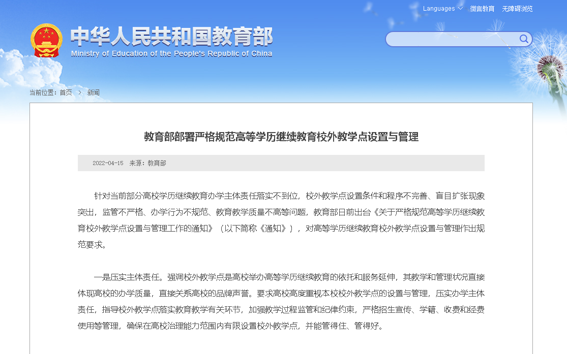 針對當(dāng)前部分高校學(xué)歷繼續(xù)教育辦學(xué)主體責(zé)任落實不到位,校外教學(xué)點設(shè)置條件和程序不完善、盲目擴(kuò)張現(xiàn)象突出,監(jiān)管不嚴(yán)格、辦學(xué)行為不規(guī)范、教育教學(xué)質(zhì)量不高等問題,教育部日前出臺《關(guān)于嚴(yán)格規(guī)范高等學(xué)歷繼續(xù)教育校外教學(xué)點設(shè)置與管理工作的通知》(以下簡稱《通知》),對高等學(xué)歷繼續(xù)教育校外教學(xué)點設(shè)置與管理作出規(guī)范要求。