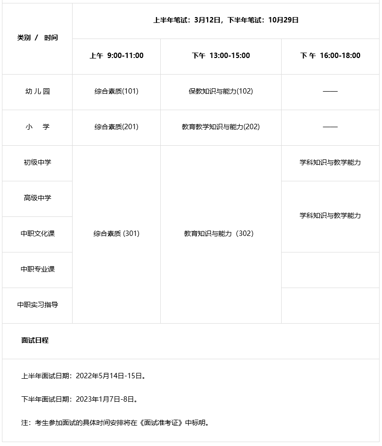 中國教育考試網(http://ntce.neea.edu.cn/)已更新2022年下半年中小學教師資格考試日程。2022年下半年中小學教師資格考試(筆試)時間為2022年10月29日(星期六);面試時間為2023年1月7日—8日。筆試報名時間為9月上旬,面試報名時間為12月中旬,具體時間以當地最新公告說明為準。
