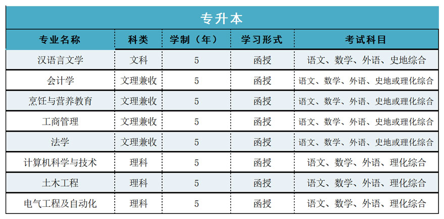 (注:招生專(zhuān)業(yè)、學(xué)制及考試科目以各招生地區(qū)省級(jí)招生考試機(jī)構(gòu)公布的為準(zhǔn))