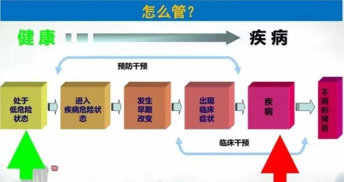 一般來說,一個人從健康到低危險狀態(tài),再到高危險狀態(tài),然后發(fā)生早期病變,出現(xiàn)臨床癥狀,最后形成疾病。這個過程可以很長,往往需要幾年到十幾年,甚至幾十年的時間。而且和人們的遺傳因素、社會和自然環(huán)境因素、醫(yī)療條件以及個人的生活方式等因素都有高度的相關(guān)性。其間變化的過程多也不易察覺。