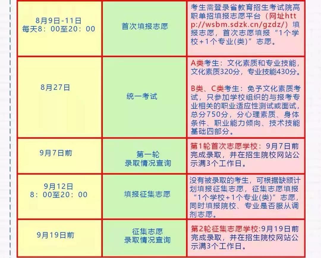 1.志愿填報。考生需登錄省教育招生考試院高職單招填報志愿平臺(網(wǎng)址:http://wsbm.sdzk.cn/gzdz/)填報志愿。考生可填報兩次志愿,第1次為首次志愿,志愿填報時間為8月9日-11日(每天8:00—20:00);第2次為征集志愿,志愿填報時間為9月12日(8:00—20:00)。首次志愿和征集志愿均填報“1個學校+1個專業(yè)(類)”志愿;征集志愿同時填報院校、專業(yè)是否服從調(diào)劑志愿。首次志愿填報結束后,考生根據(jù)各試點院校招生章程要求,到首次志愿學校繳納考試費用、打印準考證并參加考試。2.考試安排及成績上報。考生需到首次志愿學校參加考試,考試時間為8月27日(具體時間參考和遵照學校的安排)。A類考生考試內(nèi)容為文化素質(zhì)和專業(yè)技能,其中,文化素質(zhì)320分,專業(yè)技能430分。B類、C類考生免予文化素質(zhì)考試,只參加學校組織的與報考專業(yè)相關的職業(yè)適應性測試或面試,總分750分,分心理素質(zhì)、身體條件、職業(yè)能力傾向、技術技能基礎四部分。