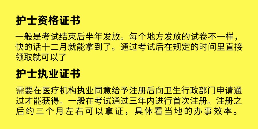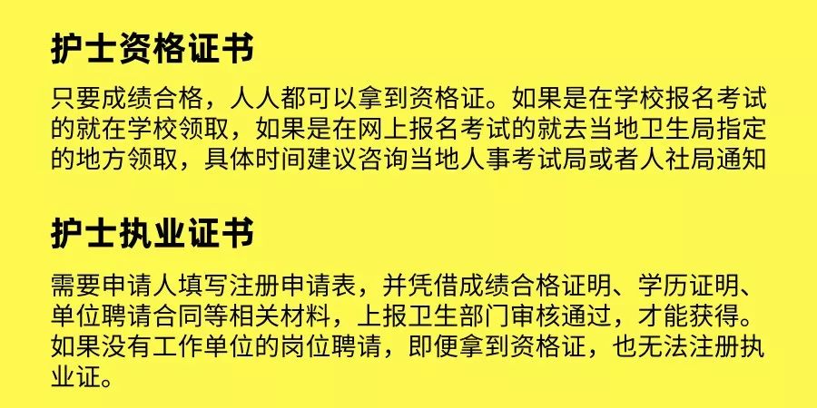 執(zhí)業(yè)證則是當(dāng)護士執(zhí)業(yè)考試成績合格后,帶著成績單、資格證、學(xué)歷證書等,由工作所在醫(yī)院統(tǒng)一上報到市衛(wèi)生局,再到省衛(wèi)生廳注冊后,再返發(fā)給各位護士(一般情況下注冊完畢返發(fā)到醫(yī)院就被直接扣下了),護士執(zhí)業(yè)證注冊時間一般是9、10月份到第二年的2月份,也就是說護士執(zhí)業(yè)證下來時間比資格證晚幾個月甚至是半年。