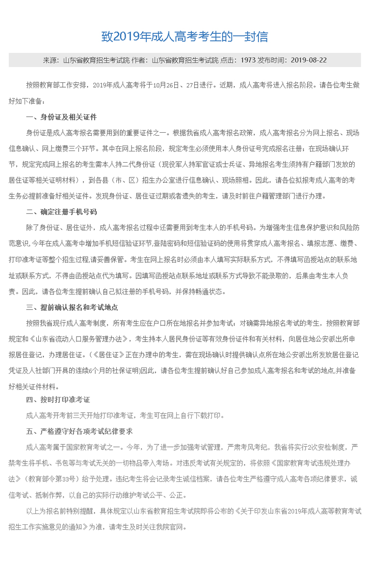 以上為報(bào)名前特別提醒,具體規(guī)定以山東省教育招生考試院即將公布的《關(guān)于印發(fā)山東省2019年成人高等教育考試招生工作實(shí)施意見的通知》為準(zhǔn),請(qǐng)考生及時(shí)關(guān)注海浪官網(wǎng)。