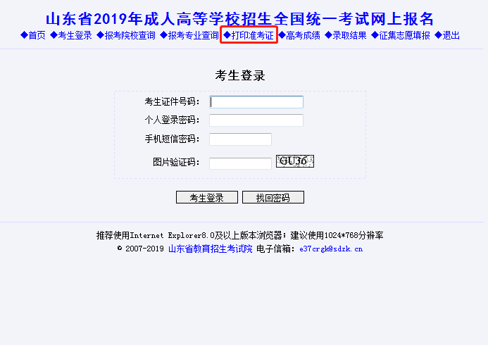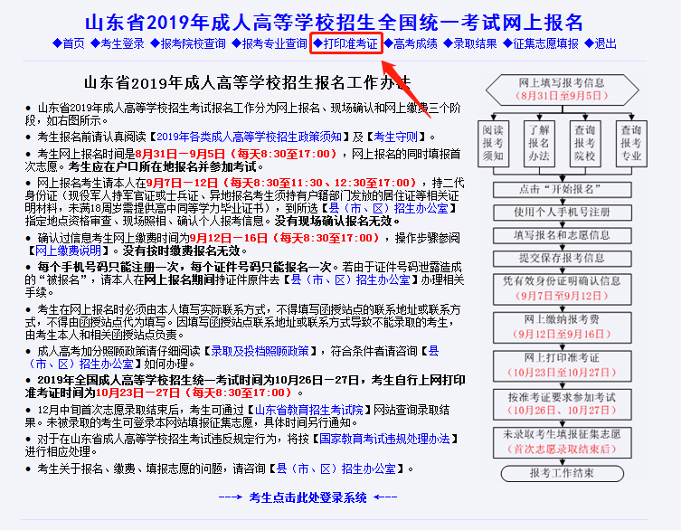 山東省2019年成人高考將于10月26日至27日進行準考證打印時間為10月23日—27日,每天8:30至17:00小編特意為大家準備了成考準考證打印入口:http://crbm.sdzk.cn/loginSms.jsp