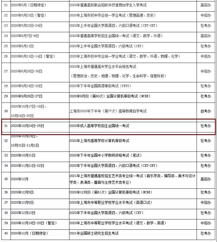 根據(jù)上海教育考試院發(fā)布的《2020年度上海市教育考試院各類考試信息一覽表》獲悉,2020年成人高考考試時間確定為10月24日-25日!