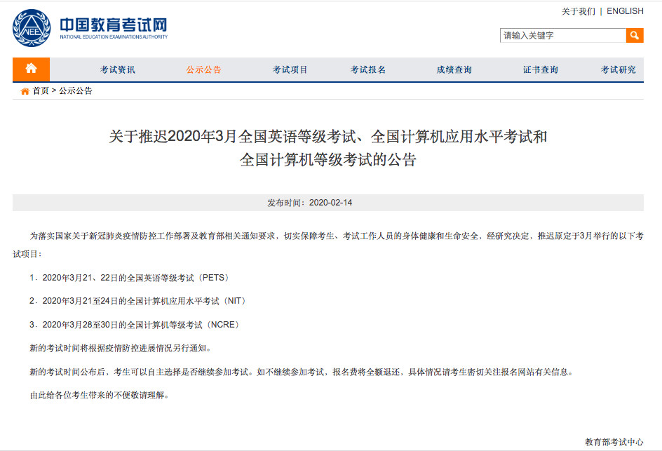 近日,教育部考試中心發(fā)布《關(guān)于推遲2020年3月全國英語等級(jí)考試、全國計(jì)算機(jī)應(yīng)用水平考試和全國計(jì)算機(jī)等級(jí)考試的公告》。