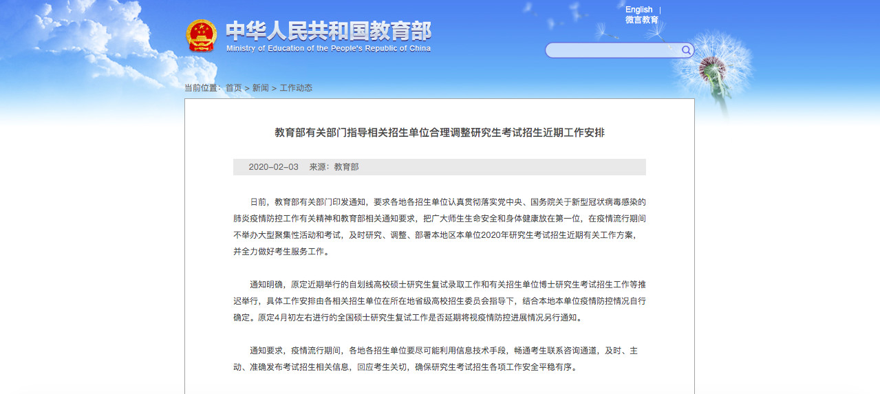 原定4月初左右進(jìn)行的全國碩士研究生復(fù)試工作是否延期將視疫情防控進(jìn)展情況另行通知。