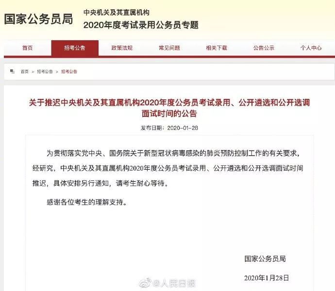 中央機(jī)關(guān)及其直屬機(jī)構(gòu)公務(wù)員考試錄用推遲