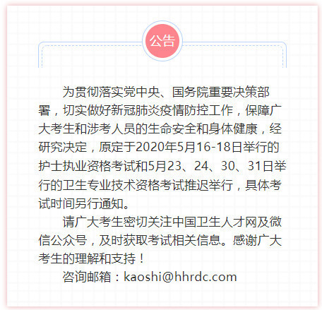 為貫徹落實(shí)黨中央、國(guó)務(wù)院重要決策部署,切實(shí)做好新冠肺炎疫情防控工作,保障廣大考生和涉考人員的生命安全和身體健康,經(jīng)研究決定,原定于2020年5月16-18日舉行的護(hù)士執(zhí)業(yè)資格考試和5月23、24、30、31日舉行的衛(wèi)生專(zhuān)業(yè)技術(shù)資格考試推遲舉行,具體考試時(shí)間另行通知。