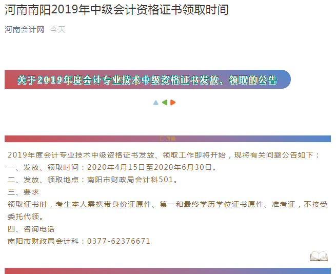 河南省南陽市中級會計證書發(fā)放、領(lǐng)取時間:2020年4月15日至2020年6月30日。