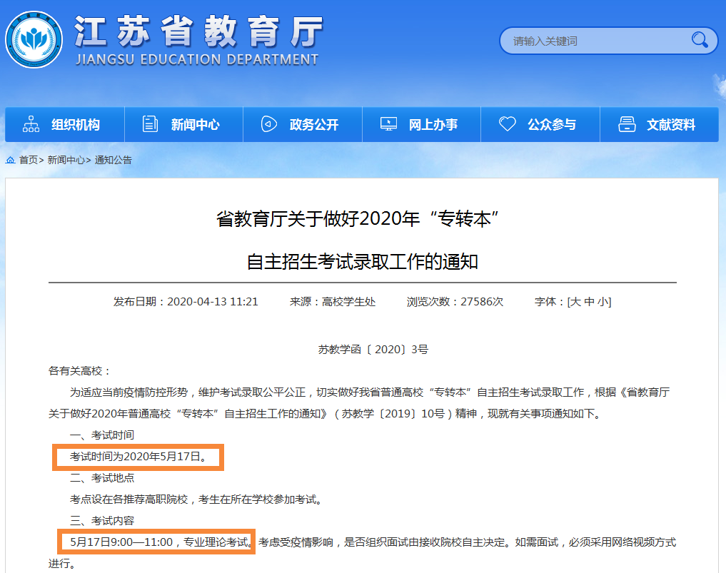 江蘇專轉(zhuǎn)本“自主招生”考試:2020年5月17日