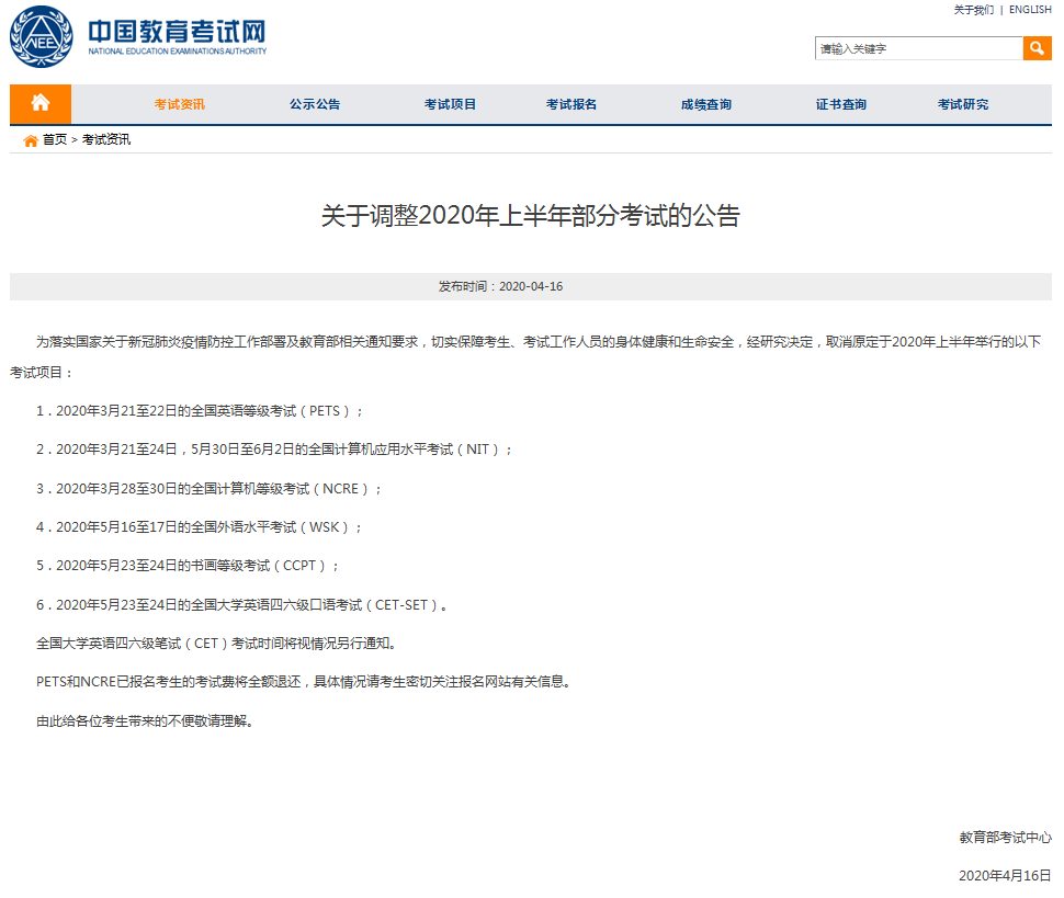 關(guān)于調(diào)整2020年上半年部分考試的公告