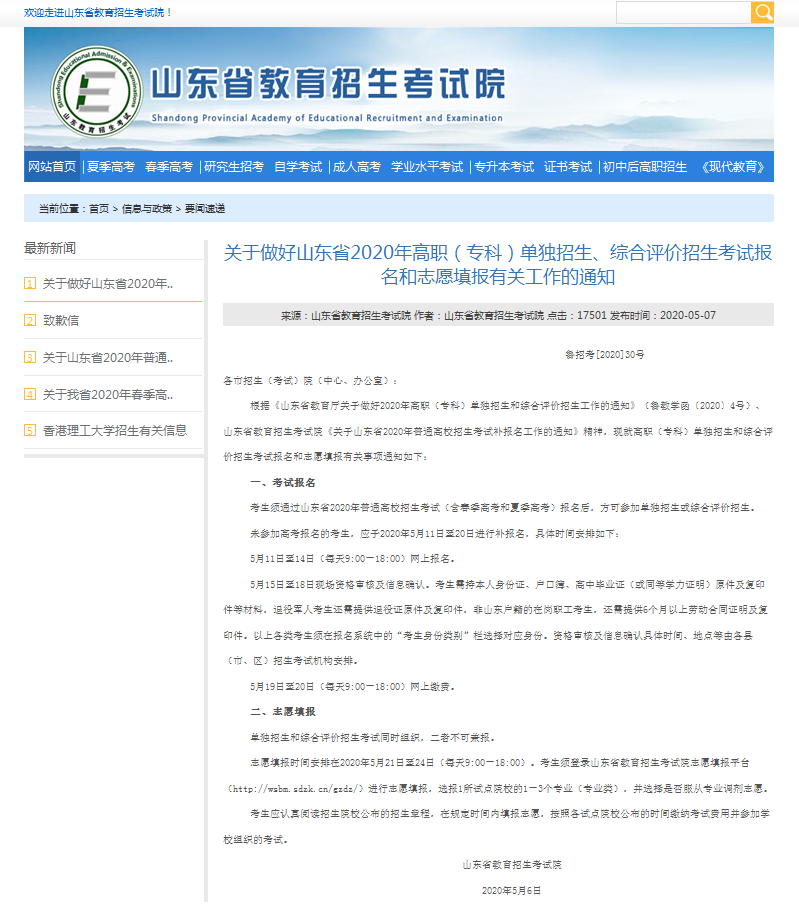 日前,山東省教育招生考試院發(fā)布了《關(guān)于做好山東省2020年高職(專科)單獨招生、綜合評價招生考試報名和志愿填報有關(guān)工作的通知》。一起來了解下考試報名和志愿填報的有關(guān)事項吧。