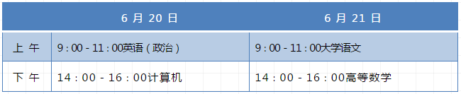 (三)考試。專升本考試時(shí)間為2020年6月20日—21日。各科考試時(shí)間安排如下: