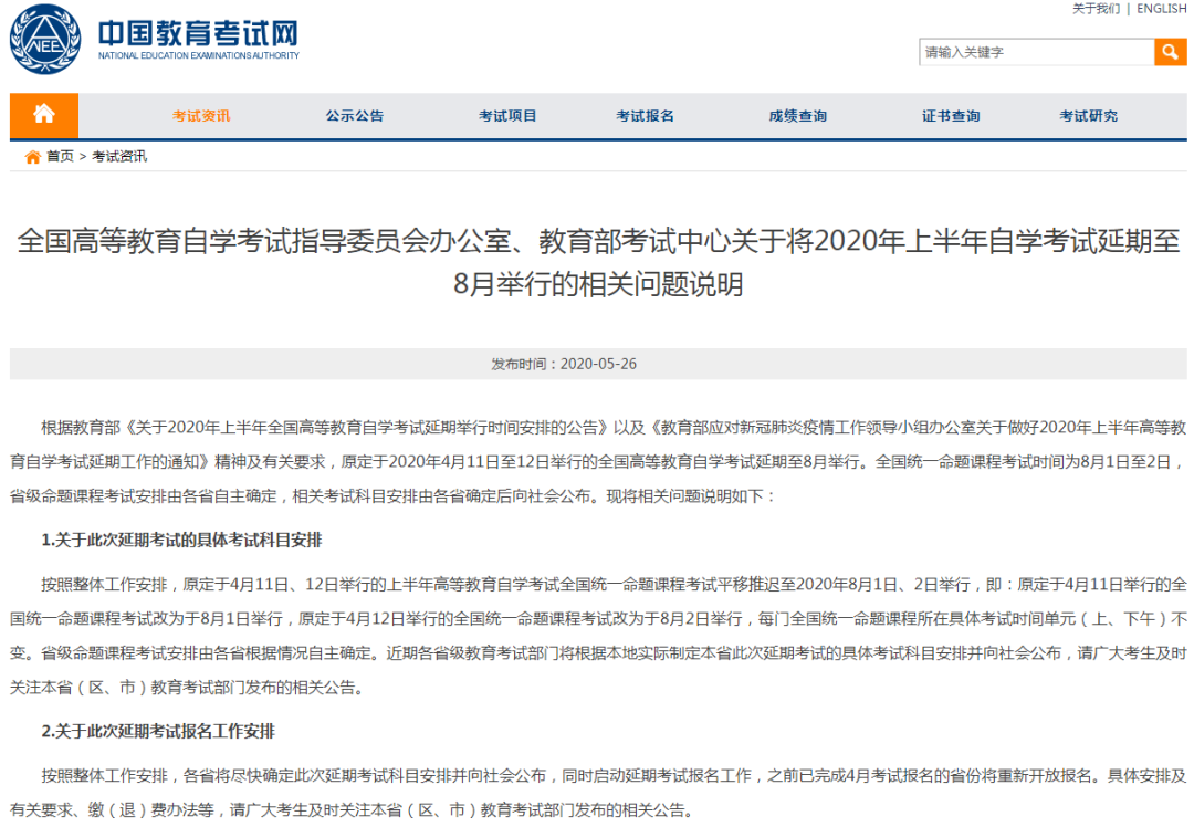 全國高等教育自學(xué)考試指導(dǎo)委員會辦公室、教育部考試中心關(guān)于將2020年上半年自學(xué)考試延期至8月舉行的相關(guān)問題說明: