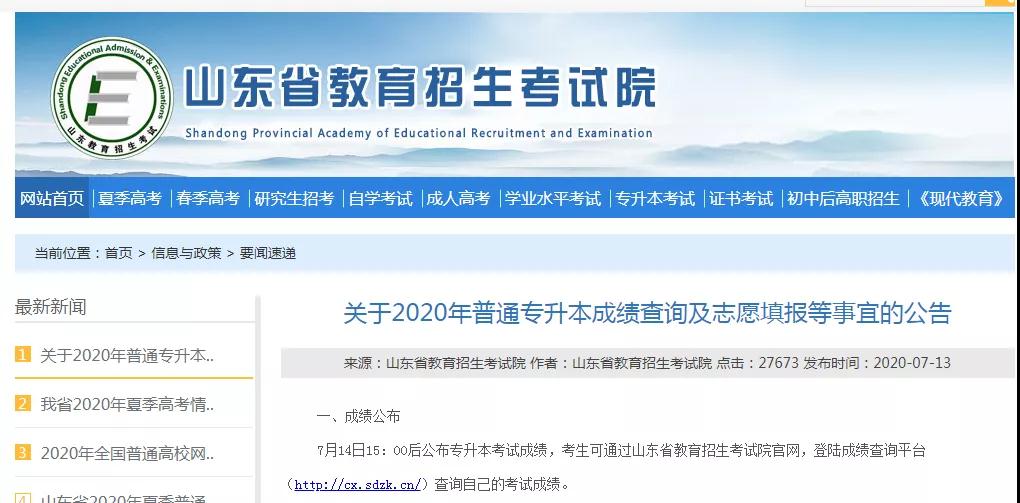 參加普通專升本考試并取得成績的考生,應于7月15 -17日(每天9:00-18:00)登陸山東省普通高等教育專科升本科考試信息平臺。