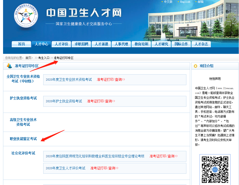 1.登陸中國衛(wèi)生人才網(wǎng)(https://www.21wecan.com/)選擇“首頁”中的【準(zhǔn)考證打印/查詢】。