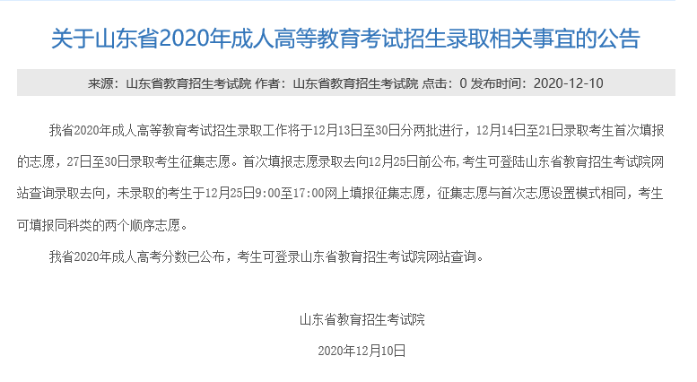 今日,山東省教育招生考試院發(fā)布關(guān)于山東省2020年成人高等教育考試招生錄取相關(guān)事宜的公告。